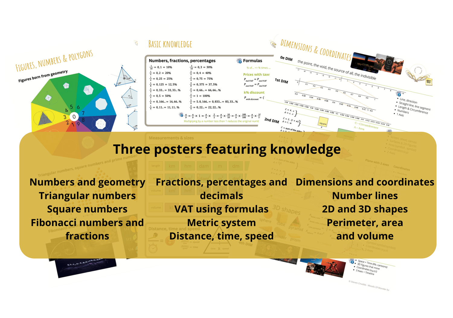three posters covering the basics of numbers, fractions, and percentages; dimensions and coordinates, polygons and polygonal planes with formulas for perimeter, area, and volume; the metric system and speed, time, and distance.